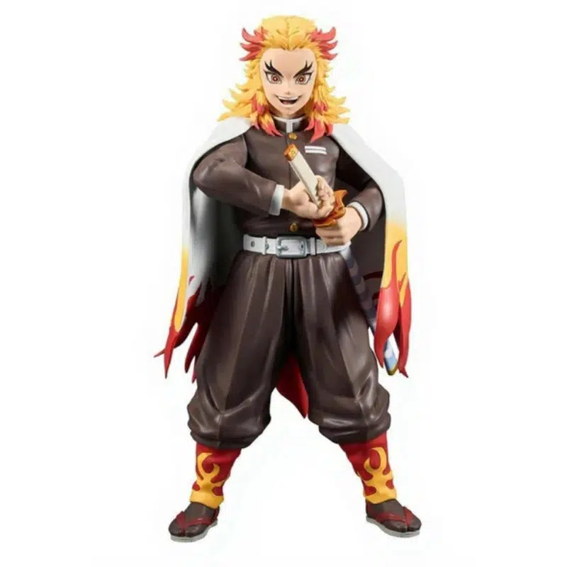 Figura prikazuje Rengokua sa plaštom i sretnim izrazom lica. Uniforma lovca na demone pažljivo je oblikovana, uključujući plamenaste uzorke, a ruke figure drže ikonasti Nichirin mač. Slikarski detalji su bogati i precizni — od plamena u kosi do nijansi na odjeći — što daje visoki vizualni dojam.