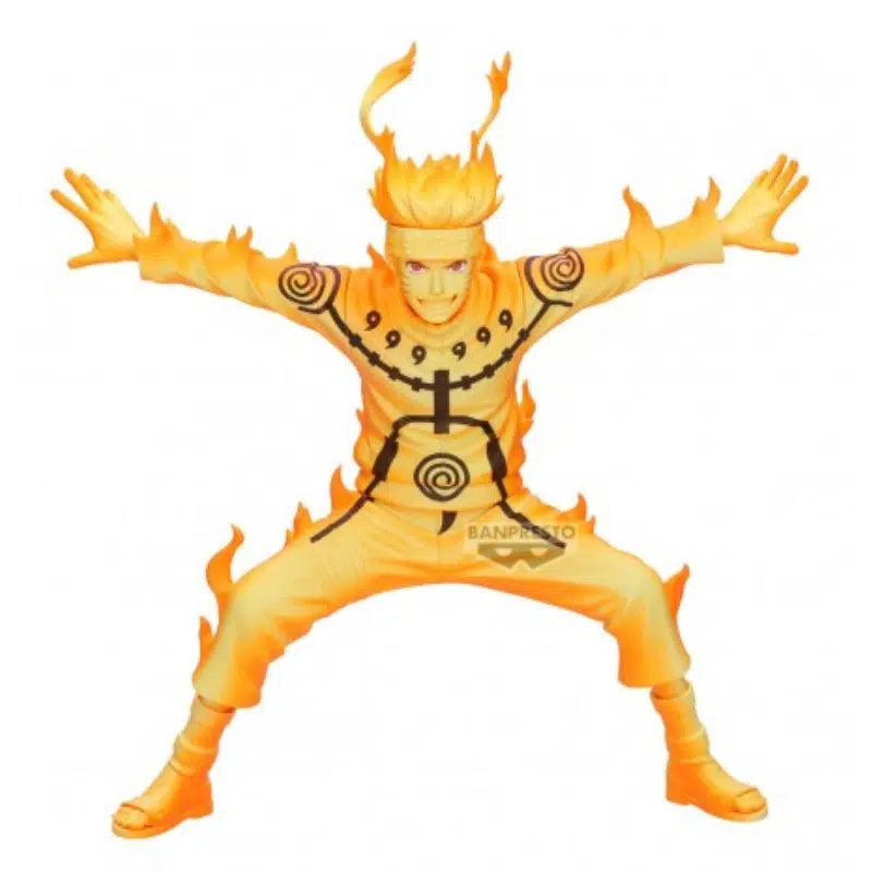 Prepoznatljiva narančasto-zlatna aura, crni simboli i energična poza s raširenim rukama savršeno dočaravaju trenutak kada Naruto oslobađa ogromnu količinu čakre.