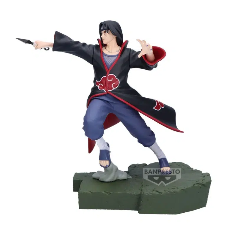 Kolekcionarska figura Uchiha Itachija iz serijala Naruto Shippuden, prikazana u borbenoj pozi s kunai nožem i prepoznatljivim Akatsuki ogrtačem. Dinamičan položaj tijela i raširene ruke stvaraju snažan dojam napetosti i spremnosti za borbu, dok izražaj lica dodatno naglašava ozbiljnost lika.